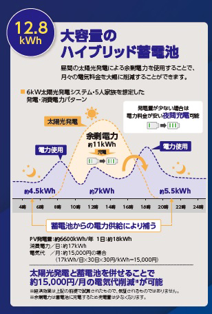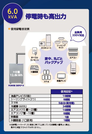 12.8kWの容量がありますので、5人家族の夜間の電力を賄うことができます。また、停電時も6kVAの高出力となっていますので、家全体の家電の電力を賄うことが可能です。