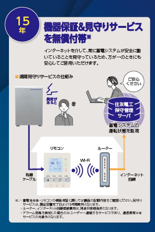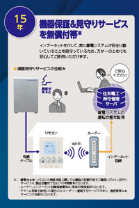 蓄電池の保証期間は10年保証が多いですが、POWER DEPO Hは15年保証と5年も長く、さらに故障の際は住友電工のサポートに直接電話すれば遠隔で遠隔で不具合を確認してもらえます。さらに蓄電池に不具合が確認されれば、住友電工が駆け付けてくれ、蓄電池の故障と思われる部分を丸々交換して最短で蓄電池を復旧してくれます。